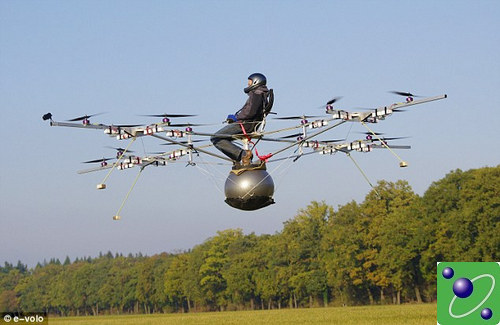 看起來造型簡陋的 multicopter,是由 16 個迷你直升飛機組合而成,用小型螺旋槳作為升空動力,而人的座位則是靠一顆類似韻律球的球體作為支撐,其系統是由地面人員所控制,有電腦幫手協調和衞星導航功能,操控員只須專心操控飛行方向及速度,就像打電動一樣容易。